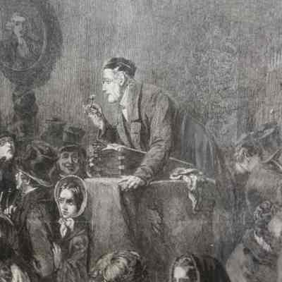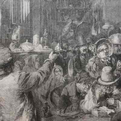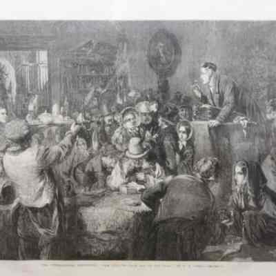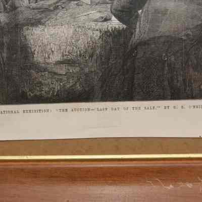 FR. 1862 ENGRAVING "THE INTERNATIONAL EXHIBITION: THE AUCTION - LAST DAY OF THE SALE." 11X15". A FULL PAGE FROM THE ILLUSTRATED LONDON NEWS PAPER. APPEARS THAT THE AUCTION WAS IN A COFFEE HOUSE WITH AUCTIONEER UP HIGH OVER LOOKING THE SEATED AND STANDING CROWD THAT IS BIDDING AND PREVIEWING. VERY DETAILED SCENE.Created By