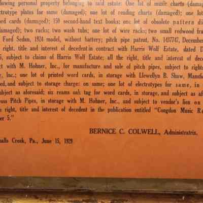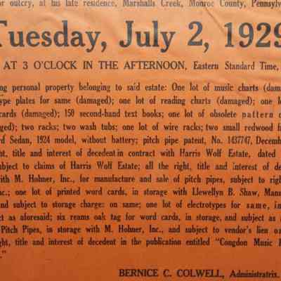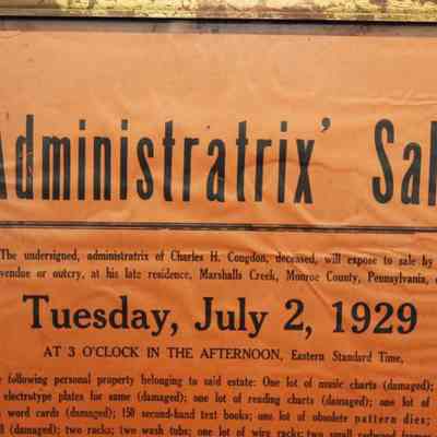 FR. 1929 PA. "ADMINISTRATRIX SALE" 14X16". A VERY UNIQUE ESTATE BROADSIDE. THE WOMAN HANDLING THE ESTATE, BERNICE C. COLWELL WS ORDERING THE SALE OF CHARLES H. CONGDON ESTATE. SHE "WILL EXPOSE TO SALE BY PUBLIC VENDUE OR OUTCRY, AT HIS LATE RESIDENCE, MARSHALLS CREEK, MONROE COUNTY, PENNSYLVANIA ON TUES. JULY 2, 1929 AT 3 O'CLOCK IN THE AFTERNOON, EASTERN STANDARD TIME (HAVEN'T SEEN "E.S.T." ON A BROADSIDE BEFORE, VERY LEGAL). THE LISTING IS VERY DETAILED, INCLUDING NOTATIONS OF DAMAGE. VERY UNUSUAL BROADSIDE.Created By