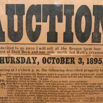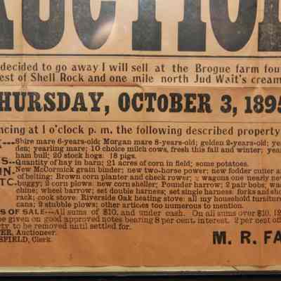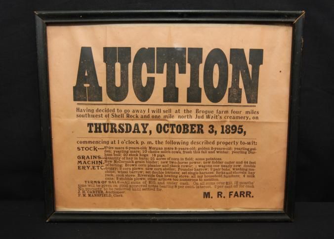 FR. 1895 IA. FARM AUCTION BROADSIDE. 9X12". AUCTIONEER J.H. CARTER WAS SELLING THE CONTENTS OF M.R. FARR'S FARM AT THE BROGUE FARM 4 MILES SOUTHWEST OF SHELL ROCK AND ONE MILE NORTH OF JUD WAIT'S CREAMERY ON THURS. OCT. 3, 1895 AT 1 O'CLOCK. INCLUDED IN THE LISTING WAS STOCK, GRAINS, MACHINERY, ETC. GREAT DETAILED LISTING. TERMS: ALL SUMS OF $10 AND UNDER CASH. $10. AND OVER 12 MONTHS TIME WITH APPROVED NOTES BEARING 8% INTEREST. 2% OFF FOR CASH.Created By