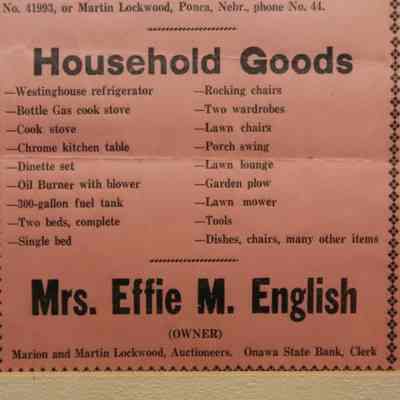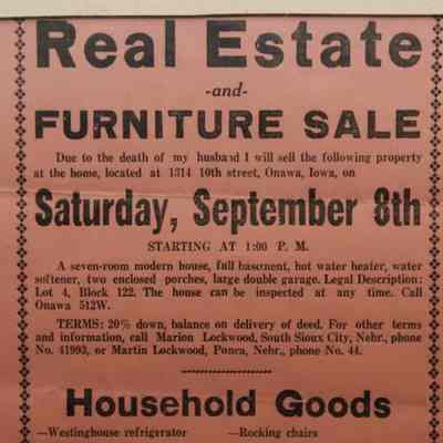 FR. C-1920'S IA. REAL ESTATE & FURNITURE AUCTION BROADSIDE. 7X10". "DUE TO THE DEATH OF MY HUSBAND I WILL SELL THE FOLLOWING PROPERTY AT THE HOME LOCATED AT 1314 10TH ST. ONAWA, IOWA ON SAT. SEPT. 8TH AT 1PM A 7 ROOM MODERN HOUSE, (DETAILED DESCRIPTION) HOUSEHOLD GOODS ( NICE LIST) MRS. EFFIE M. ENGLISH OWNER" THE AUCTIONEERS WERE MARION AND MARTIN LOCKWOOD.Created By