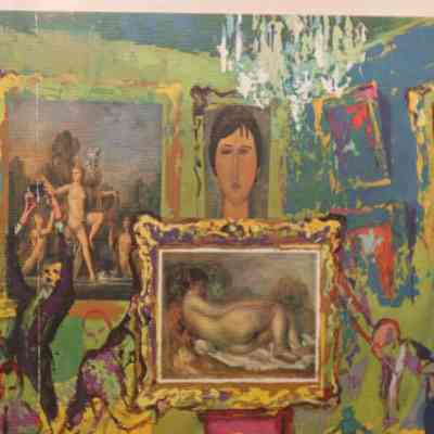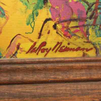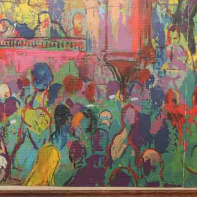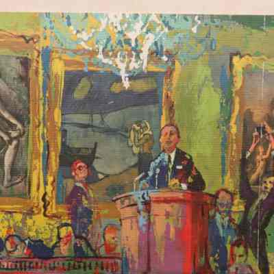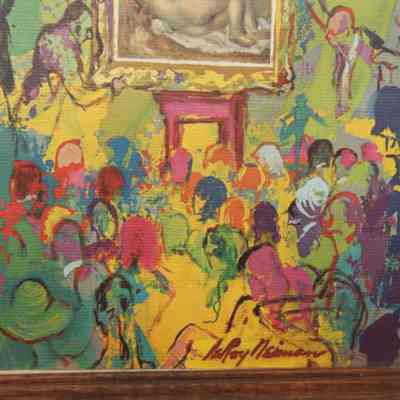 FR. CONTEMPORARY LEROY NEIMAN AUCTION SCENE PRINT. 10 1/2X15". UNTITLED. APPEARS TO BE A "PICTURE SALE" AT SOTHEBY'S WITH AUCTIONEER IN THE "ROSTRUM", A PAINTING OF NUDE ON THE BLOCK, LARGE CROWD IN FOREGROUND.Created By