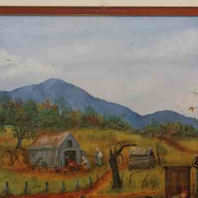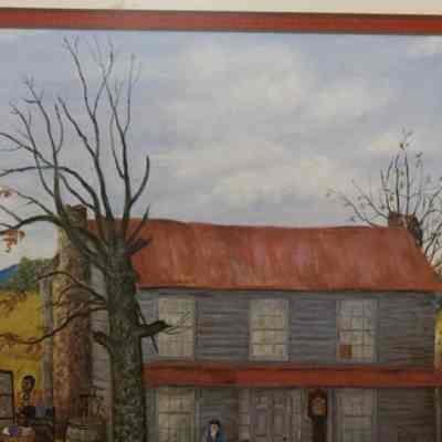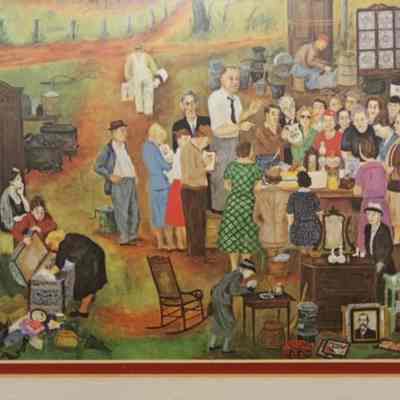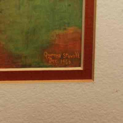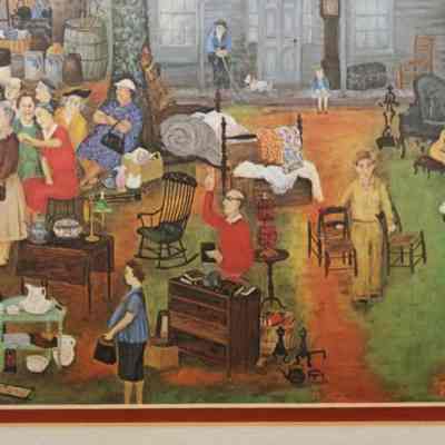 FR. COLORFUL "COUNTRY AUCTION" PRINT. SIGNED "QUEENA STOVALL 1960" 11X15 1/2" DOUBLE MATTED AND FRAMED TO 17 1/2X22 1/2". aUCTIONEER WITH TIE ON SELLING TO A CROWD OF MOSTLY WOMEN ON-SITE AT A FARM. pEOPLE PREVIEWING, BIDDING, LOADING OUT. TYPICAL KIDS AND PETS ON-SITE. GREAT DETAILS. A WONDERFUL FALL AUCTION SCENE.Created By