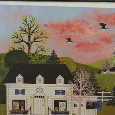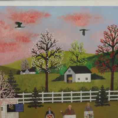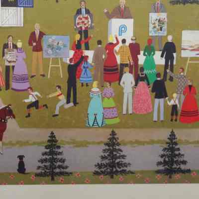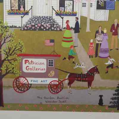 FR. CONTEMPORARY PRINT "THE GARDEN AUCTION" BY WOOSTER SCOTT. 17X20". VERY COLORFUL WITH DETAIL OF WELL DRESSED AUCTIONEER AND STAFF, BIDDERS, CHILDREN, DOG, HORSEDRAWN "PATRICIAN GALLERIES FINE ART" DELIVERY WAGON.Created By