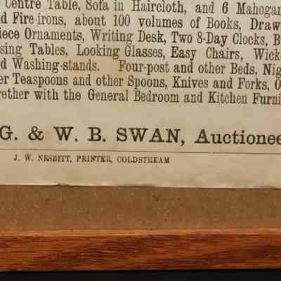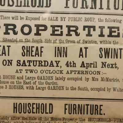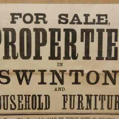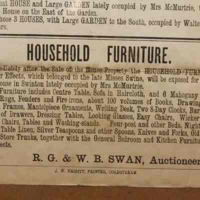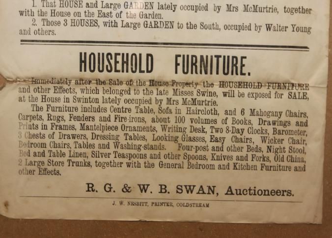 FR. 19THC ENGLISH REAL & PERSONAL PROPERTY AUCTION BROADSIDE. 11X17 1/2". THIS IS A SALE BY "PUBLIC ROUP" OF PROPERTIES IN SWINTON INCLUDING 4 HOUSES AND GARDENS PLUS A NICE LISTING OF HOUSEHOLD AND FURNITURE ITEMS. THE AUCTIONEERS WERE "R.G. & W.B. SWAN."Created By