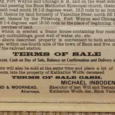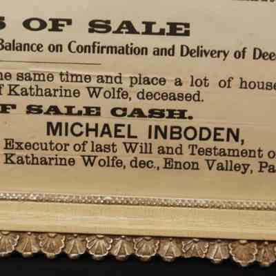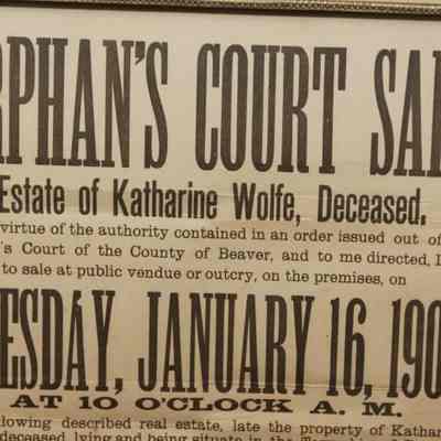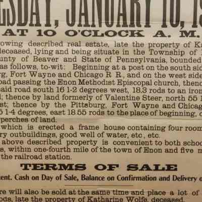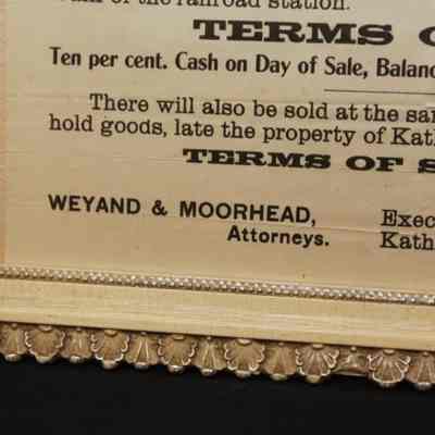 FR. 1906 PA. REAL ESTATE AUCTION BROADSIDE. 10 1/2X13 1/2". THIS WAS AN "ORPHAN'S COURT SALE" (HAVE ONLY ENCOUNTERED THIS TERMINOLOGY IN PA.) TO SETTLE THE ESTATE OF KATHERINE WOLFE. NOTE THAT THE DATE WAS CORRECTED FROM 1905 TO 1906. IT SEEMS IT WAS MORE PRUDENT TO CHANGE THE "5" TO A "6" THEN TO RE-PRINT THE BROADSIDE. THE AUCTION WAS HELD IN THE TOWNSHIP OF DARLINGTON, COUNTY OF BEAVER AT 10AM ON JANUARY 16TH. SOME HOUSEHOLD ITEMS WERE TO BE SOLD ON-SITE AS WELL.Created By