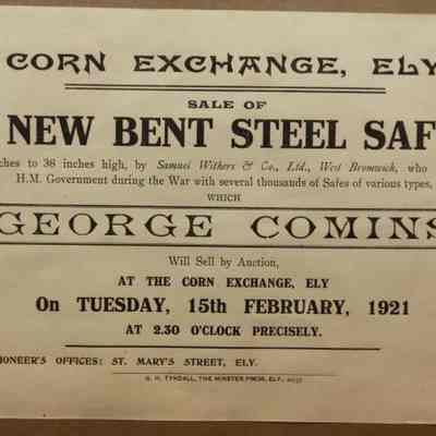 FR. 1921 BROADSIDE 8 1/2 X 5 1/2". AUCTIONEER GEORGE COMINS. SEVERAL THOUSAND OF HIS MAJESTIES SAFES OF VARIOUS SIZES FROM THE WAR.Created By