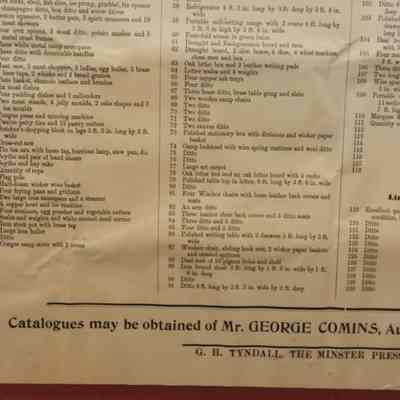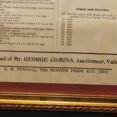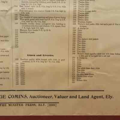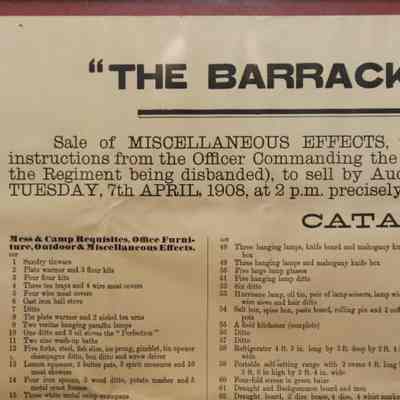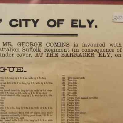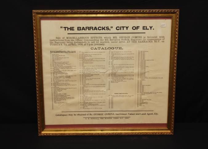 FR. 1908 CATALOG BROADSIDE FOR "THE BARRACKS" AUCTION. 15X18" GEORGE COMINS WAS TO SELL THE CONTENTS OF THE SIBANDED 4TH REGIMENT. AUCTION AT THE BARRACKS ELY.Created By