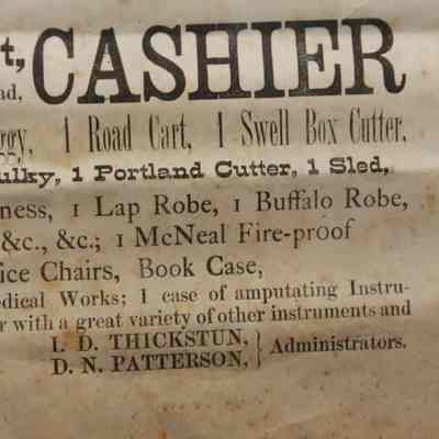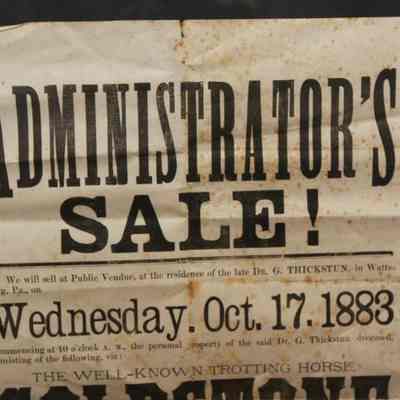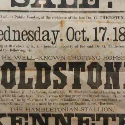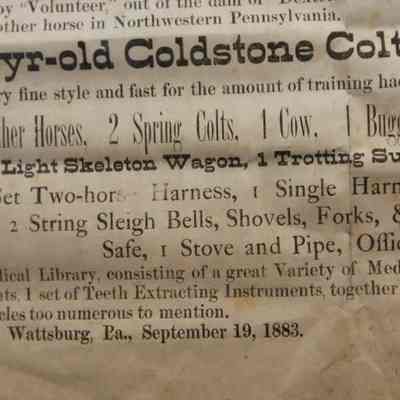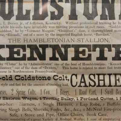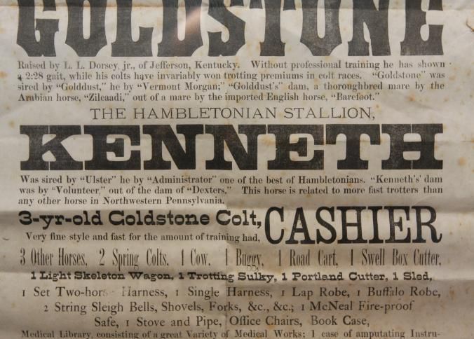 FR. 1883 PA TROTTING HORSE AUCTION BROADSIDE. 12X18". A "PUBLIC VENDUE AT THE RESIDENCE OF DR. G. THICKSTUN IN WATTSBURG, PA. "GOLDSTONE" WELL KNOWN TROTTING HORSE RAISED IN JEFFERSON, KENTUCKY. THIS IS A FABULLOUS BROADSIDE WITH INTERESTING LISTING AND INFORMATION. ITEMS INCLUDED "AMPUTATION & TEETH EXTRACTING INSTRUMENTS."Created By