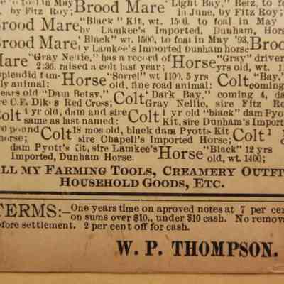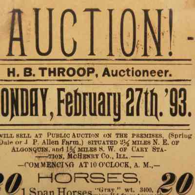 FR. 1893 ILL. HORSE AUCTION CARD. 4X6" AUCTIONEER: H.B. THROOP. LOTS OF HORSES, COLTS, FARMING TOOLS, CREAMERY OUTFIT AND HOUSEHOLD GOODS.Created By