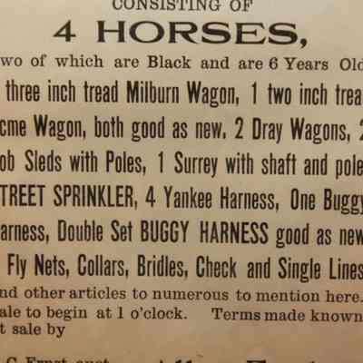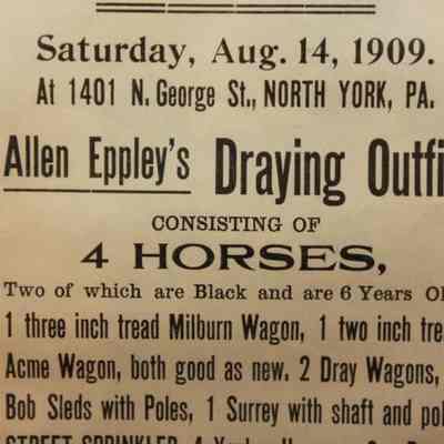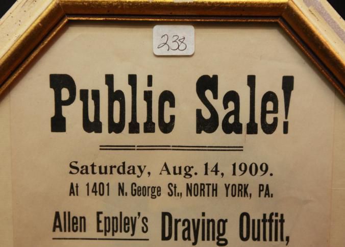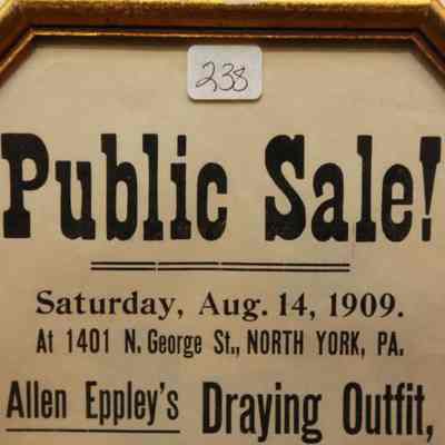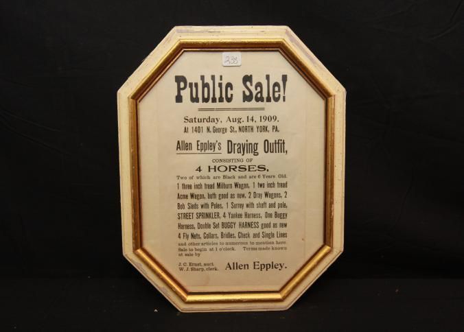 FR. 1909 PA FARM AUCTION BROADSIDE. 6X9" NORTH YORK, PA. AUCTIONEER J.C. ERNST. GREAT LISTING WITH "OTHER ARTICLES TOO NUMEROUS TO MENTION HERE." 1PM START.Created By
