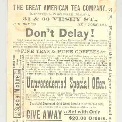 AD, 1885, TEA, 4" X 8 1/2 NY. THE GREAT AMERICAN TEA COMPANY. FINE TEAS AND PURE COFFEES. 3 PANELS ON FRONT "GOING, GOING, GONE" BABY POUT AND CRY. "THE YOUNG AUCTIONEER" BACK IS PRINTED PRICES AND ADCreated By