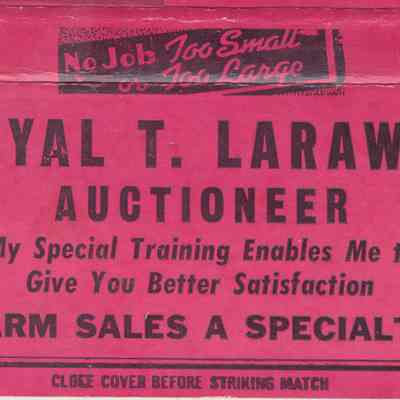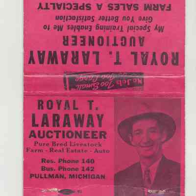 MATCHBOOK, FARM, REAL ESTATE, AUTO, MI. ROYAL T. LARAWAY, AUCTIONEER, PORTRAIT PHOTO ONE SIDE.