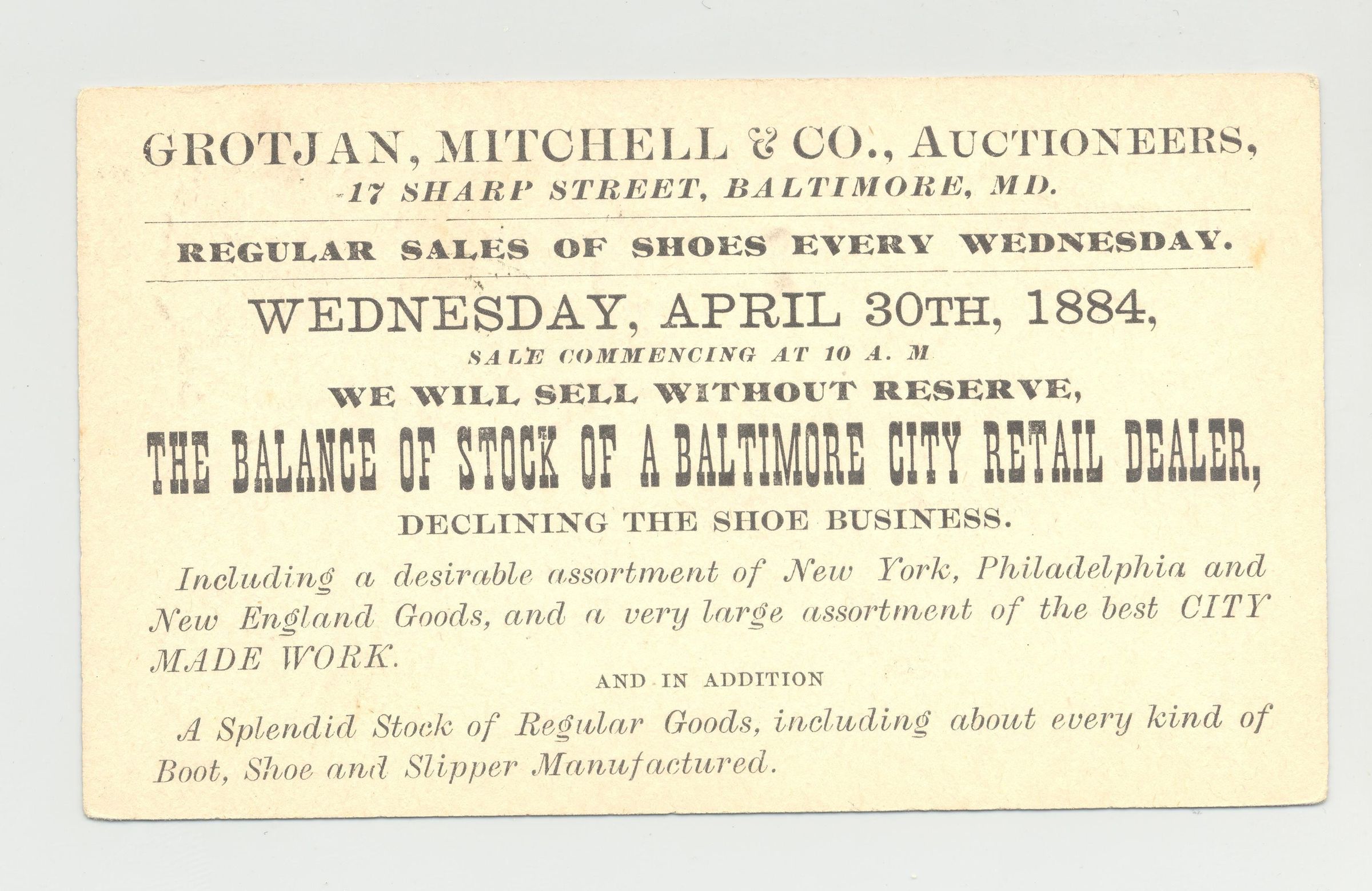 PSTCD, 1884, SHOES, MD. GROTJAN, MITCHELL, AND CO. AUCTIONEERS.
