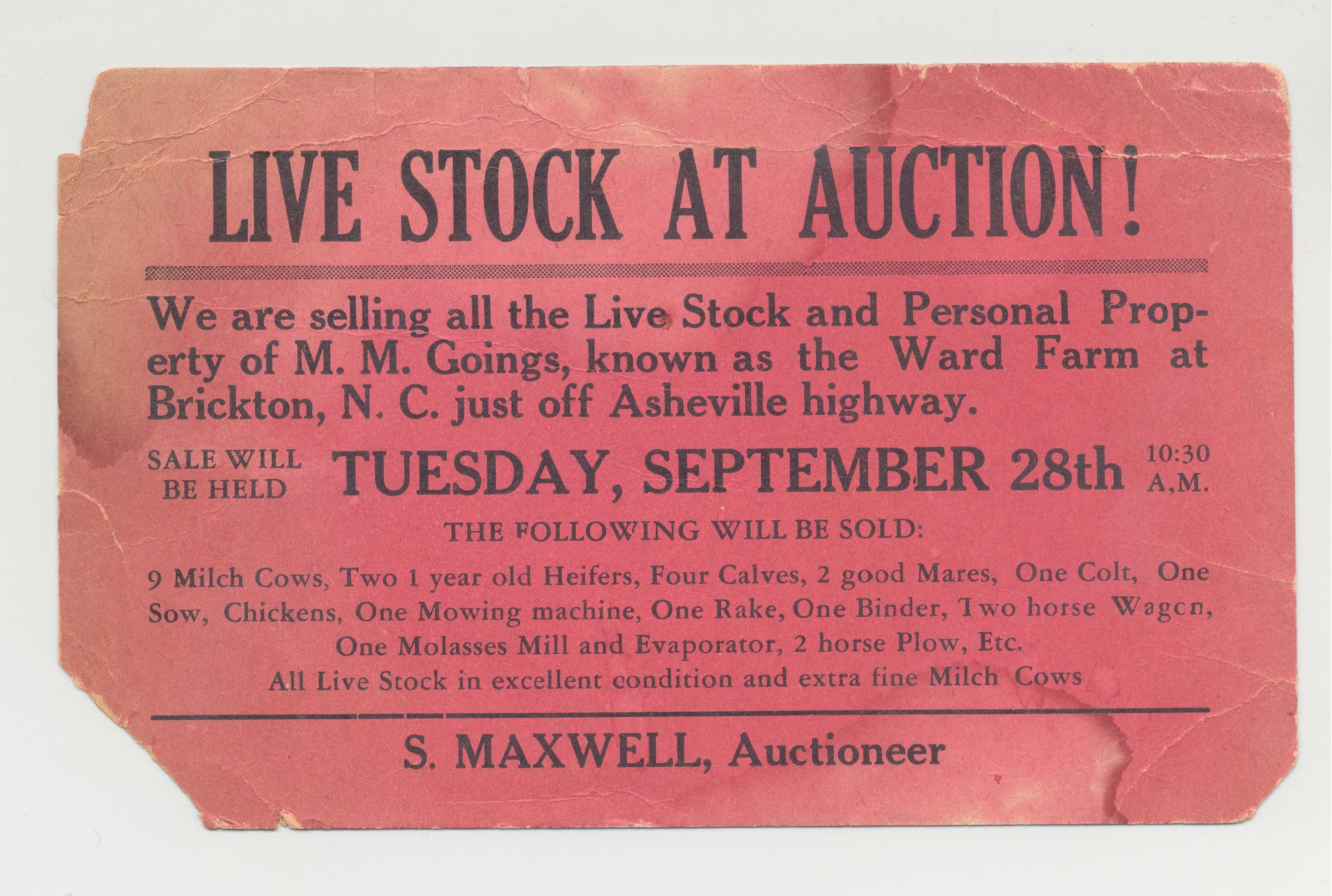 ADV PSTCD, LIVESTOCK, NC, S. MAXWELL. 4.5" X 7"