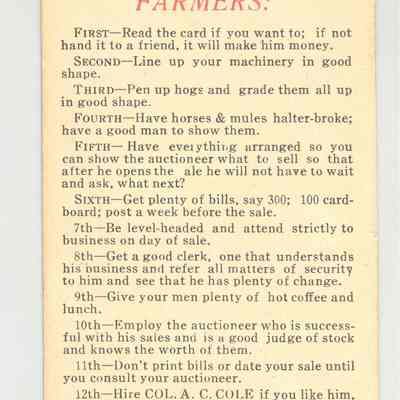 BSCD, KS. A.C. COLE GENERAL AUCTIONEER, CHERRYVALE, KANSAS "A DOZEN HINTS TO FARMERS" ON BACK