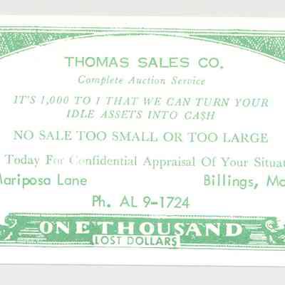 ADV, IMIT. PAPER MONEY, MT. NAA LOGO, BONDED MEMBER. THOMAS SALES CO. "IT'S 1000 TO 1 WE CAN TURN YOUR IDLE ASSETS INTO CASH. TRUST IN US TO GET ACTION FOR YOU"Created By