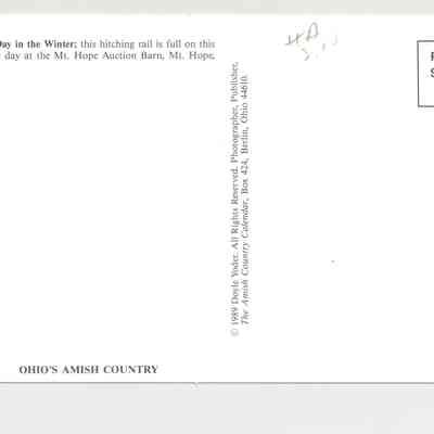 PSTCD, COLOR PRINT HORSES/BUGGIES, OH. "SALE DAY IN THE WINTER, THIS HITCHING RAIL IS FULL ON THIS SNOWY DAT AT THE MT HOPE AUCTION BARN, MT. HOPE, OHIO"Created By