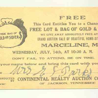 ADV CARD, LAND, MO. LOTTERY ON BACK. CONTINENTAL REALTY AUCTION CO. FREE LOT AND BAG OF GOLD AND SILVER PRIZE " SEE AND HEAR THE WORLD RENOWNED TWIN AUCTIONEERS"Created By
