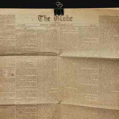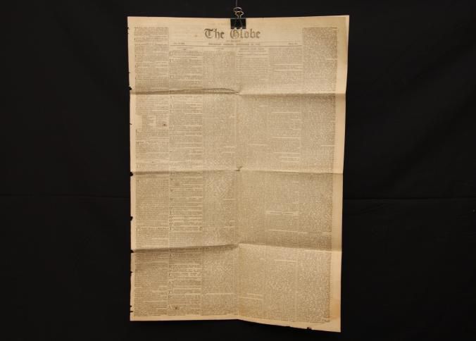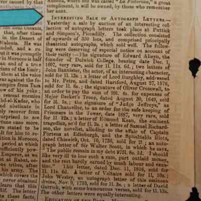 NEWSPAPER, 1847, AUTOGRAPHED LETTERS. PUTTICK AND SIMPSON'S, PICCADILLY. VOLTAIRE, SIR WALTER SCOTT, OLIVER CROMWELL & OTHERS MENTIONED, PRICES NOTED. 24" X 17 3/4" FOLDED PAPERCreated By