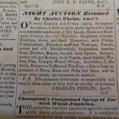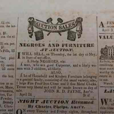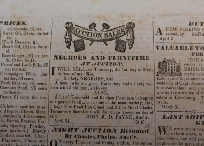 AD, NEWSPAPER, SLAVE, 1845, LYNCHBURG, VA. AD UNDER AUCTION SALES: NEGROES AND FURNITURE AT AUCTION. JOHN PAYNE, AUCT'R. ALSO, BACK PAGE POLITICAL POEM - "NOT ON THE BATTLEFIELD"Created By