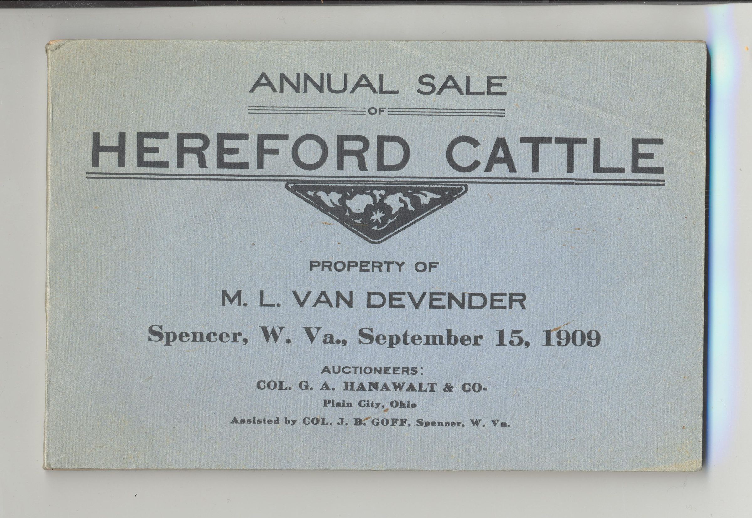 CAT, CATTLE, 1909, WV. ANNUAL SALE OF HEREFORD CATTLE. COL. G.A. HANAWALT & CO. 25 PP. 6" X 4"