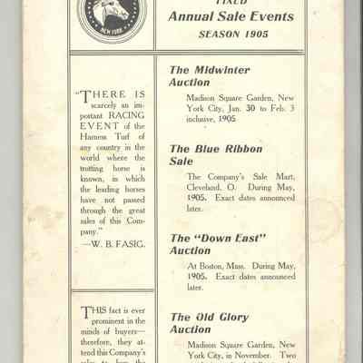 CAT, HORSE, 1905, NY. ABSOLUTE DISPERSAL OF VILLAGE FARM, EAST AURORA, NY. HELD AT MADISON SQ GARDEN, NYC. 36 PP. 5" X 8", B/W PRINT ON COVER.Created By