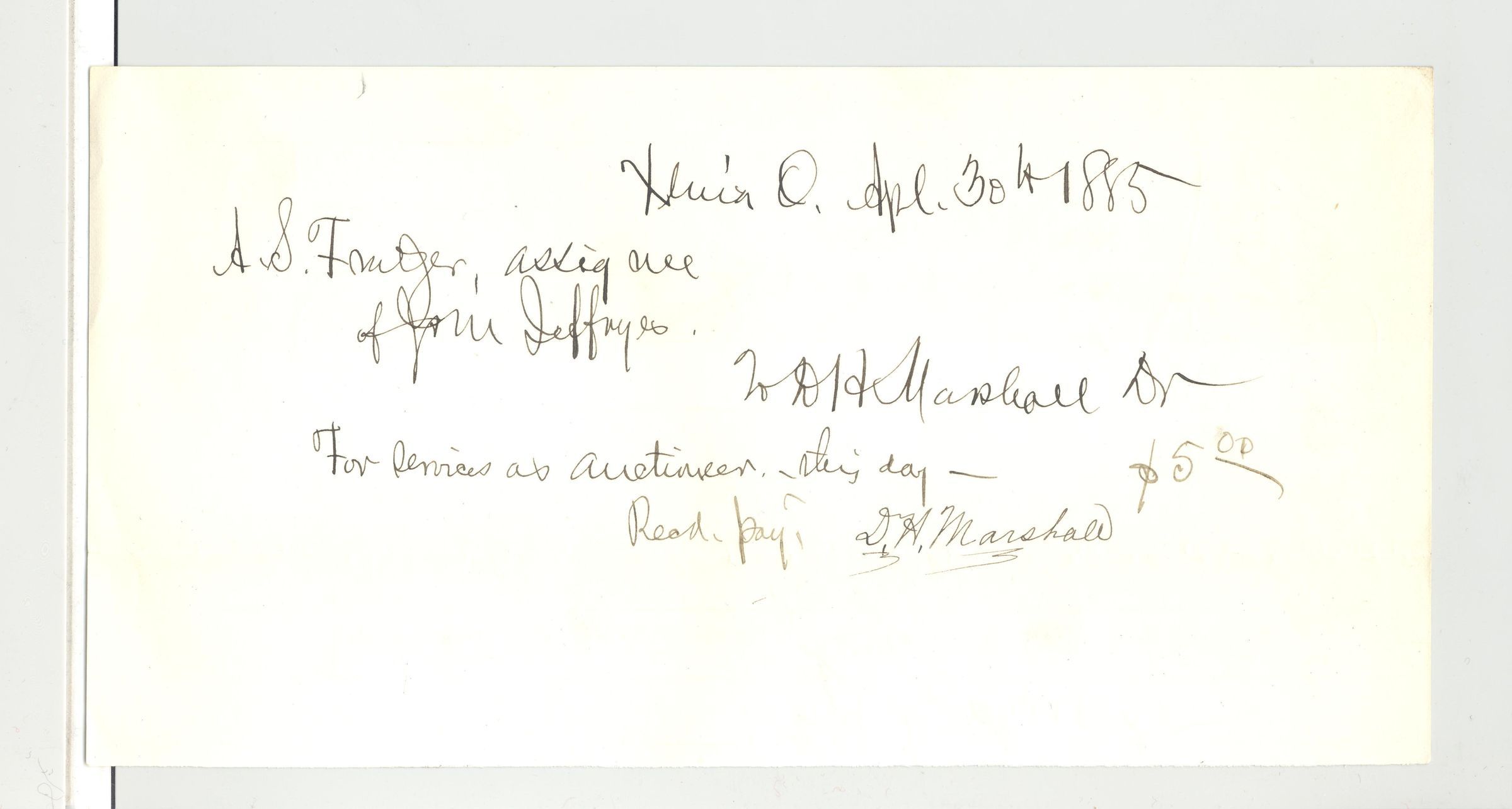 REC, 1885, OH. $5 FOR SERVICES AS AUCTIONEER. SIGNED D.H. MARSHALL