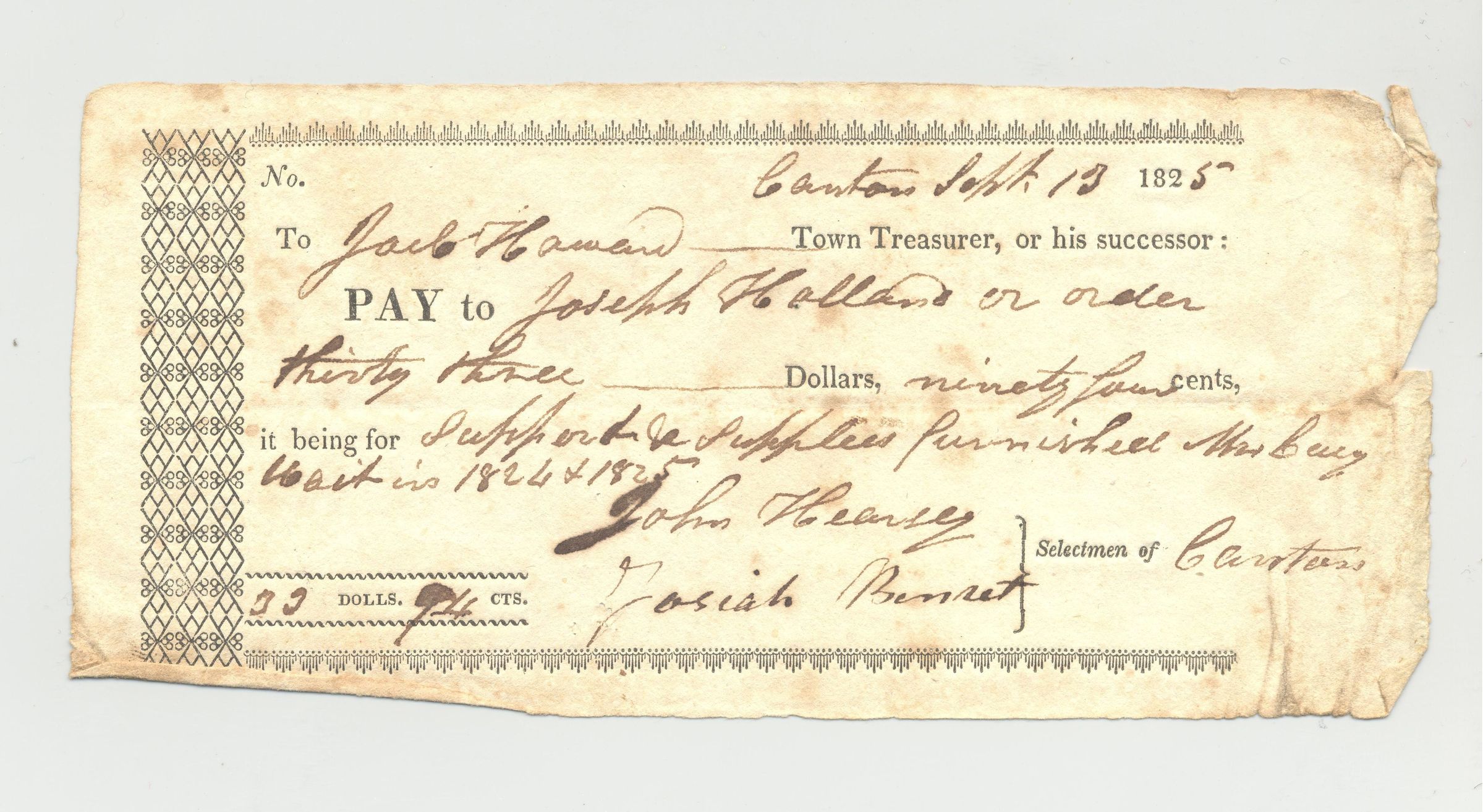 DOC, 1825. NOTE ISSUED BY CANTON SELECTMEN JOHN HEARSEY AND JOSIAH BENNET, AUTHORIZES PYMT TO JOSEPH HOLLAND 'FOR SUPPORT AND SUPPLIES FURNISHED MRS. LUCY WEST IN 1824 & 1825" RELATES TO PRACTICE OF AUCTIONING OFF TOWN PAUPERS TO LOWEST BIDDER. BIDDER PROVIDES MEALS, LODGING, OTHER SUPPLIES FOR THIS AMT.Created By