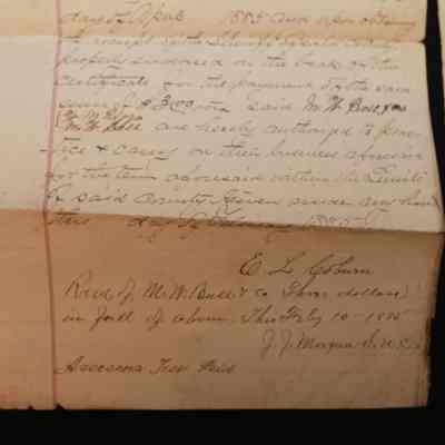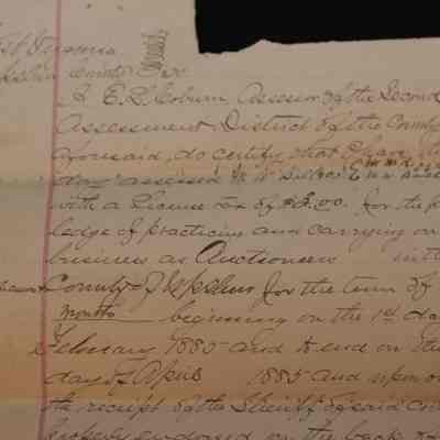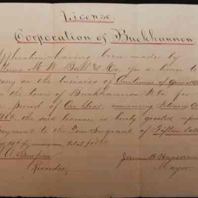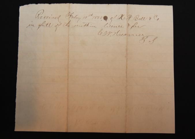 DOC, 1885, LICENSE, WV. TWO DOCS. ONE ACTUAL LICENSE FOR CORP. OF BUCKHANNON, MR. BALL & CO. "AUCT. OF GENERAL GOODS" LICENSE. SIGNED JAMES HANSON, MAYOR. ONE DOC REPORTING TAX OF $3.00 PD, AND 2 MONTH TERM OF LICENSE, SIGNED E.L. COBURN.Created By