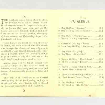 CAT, HORSE, 1887, NY. ABSOLUTE AND UNRESERVED SPECIAL SALE OF THE NY AND PELHAM "TANTIVY" COACH HORSES. CENTRAL PARK RIDING SCHOOL. PRICES WRITTEN 2 7/8" X 4 3/8"Created By
