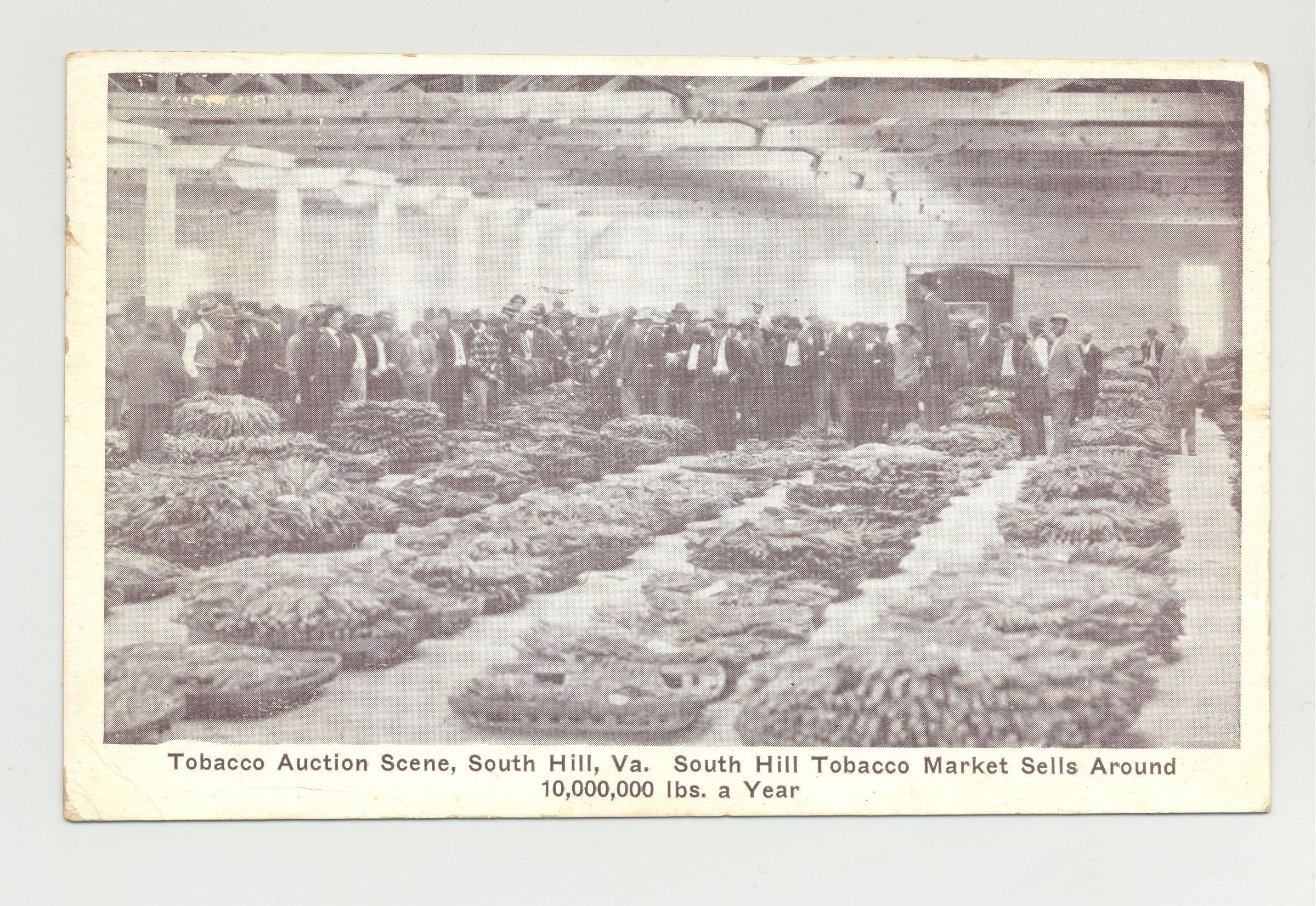 PSTCD, 1934, TOBACCO, VA. "TOBACCO AUCTION SCENE, SOUTH HILL, VA. SOUTH HILL TOBACCO MARKET SELLS AROUND 10,000,000 LBS A YEAR"Created By