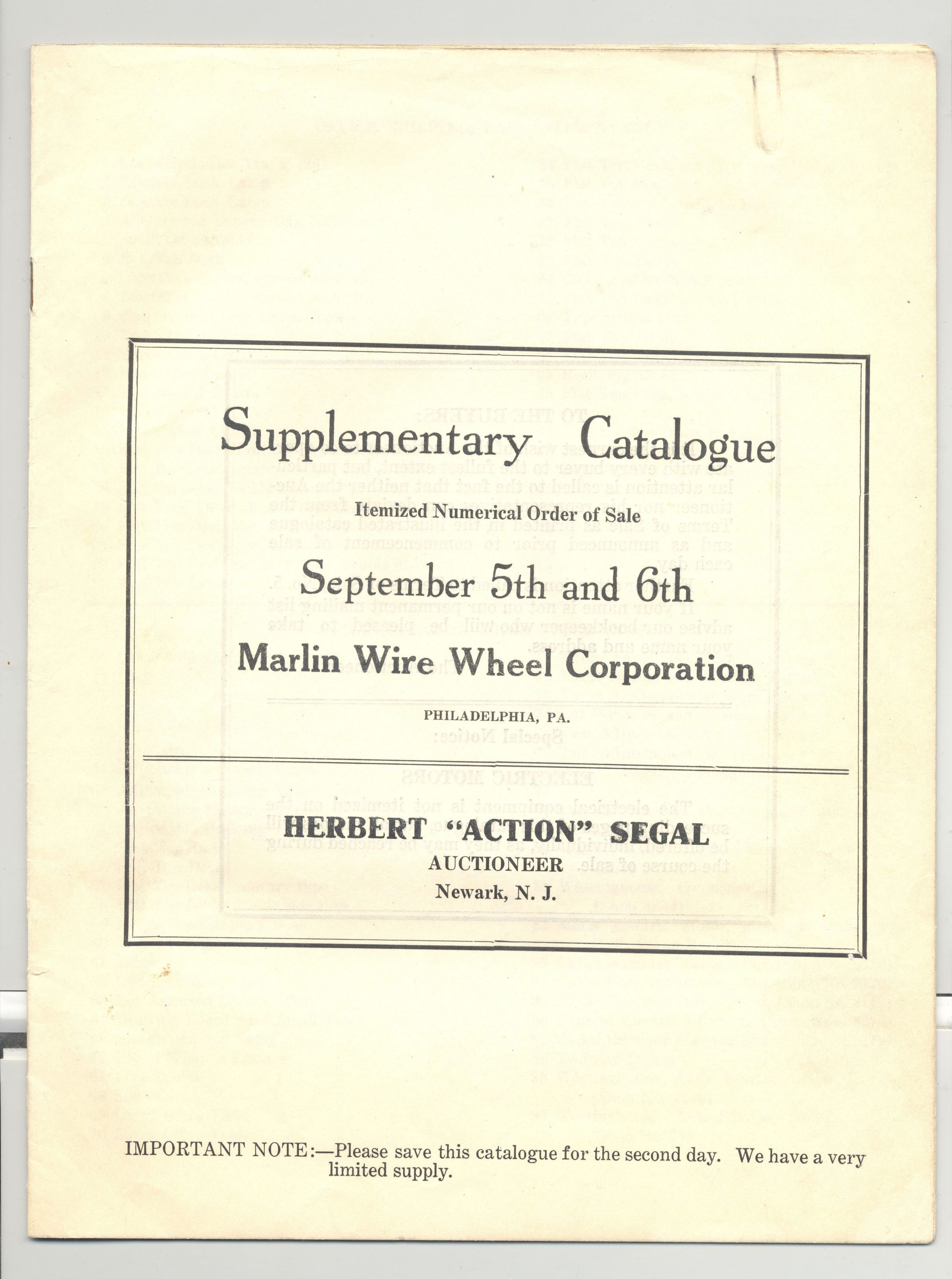 CAT, COMMERCIAL LIQUIDATION, EQUIPMENT, PA. NO YEAR. HERBERT "ACTION" SEGAL, AUCT. NJ. MARLIN WIRE WHEEL CORP. 8" X 10 1/2" 18 PP.Created By