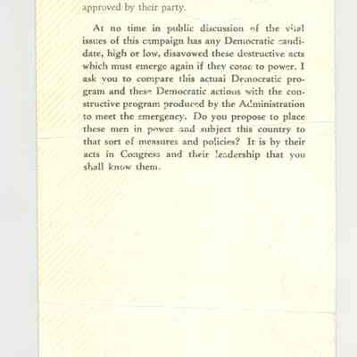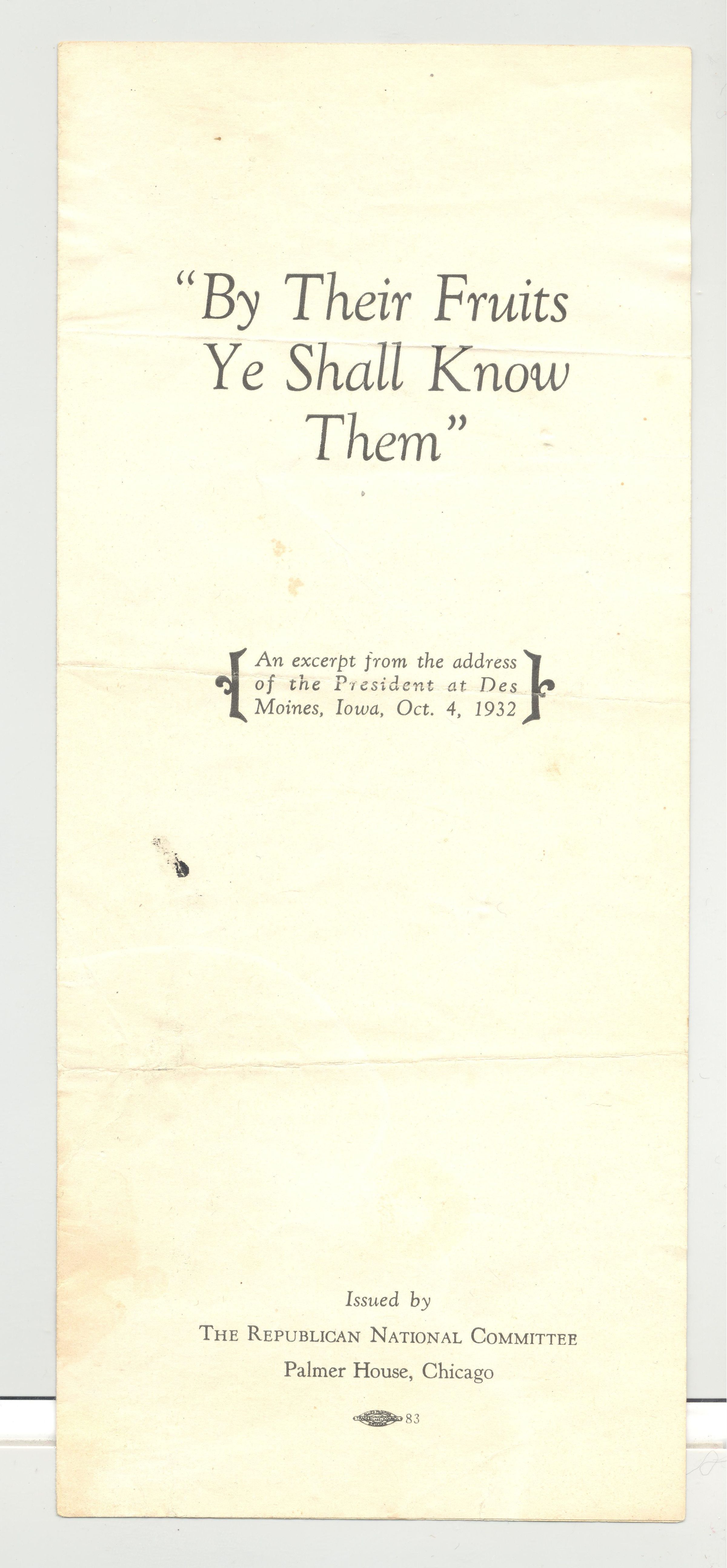 PAM, POLITICAL, 1932, IA. "BY THEIR FRUITS YE SHALL KNOW THEM" AN EXCERPT FROM THE ADDRESS OF THE PRESIDENT AT DES MOINES.." ISSUED BY THE REPUBLICAN NATIONAL COMMITTEE.Created By