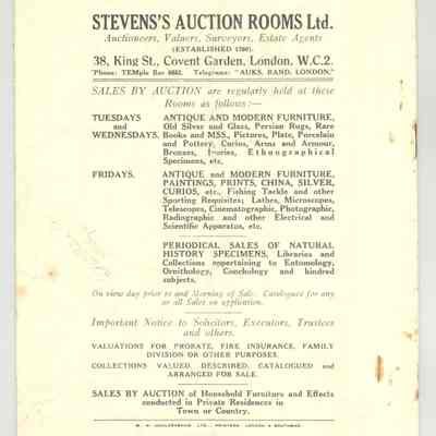 CAT, ANTIQUES, 1933, LONDON. STEVENS'S AUCTION ROOMS, LTD. 14 PP. 6 1/2" X 8"