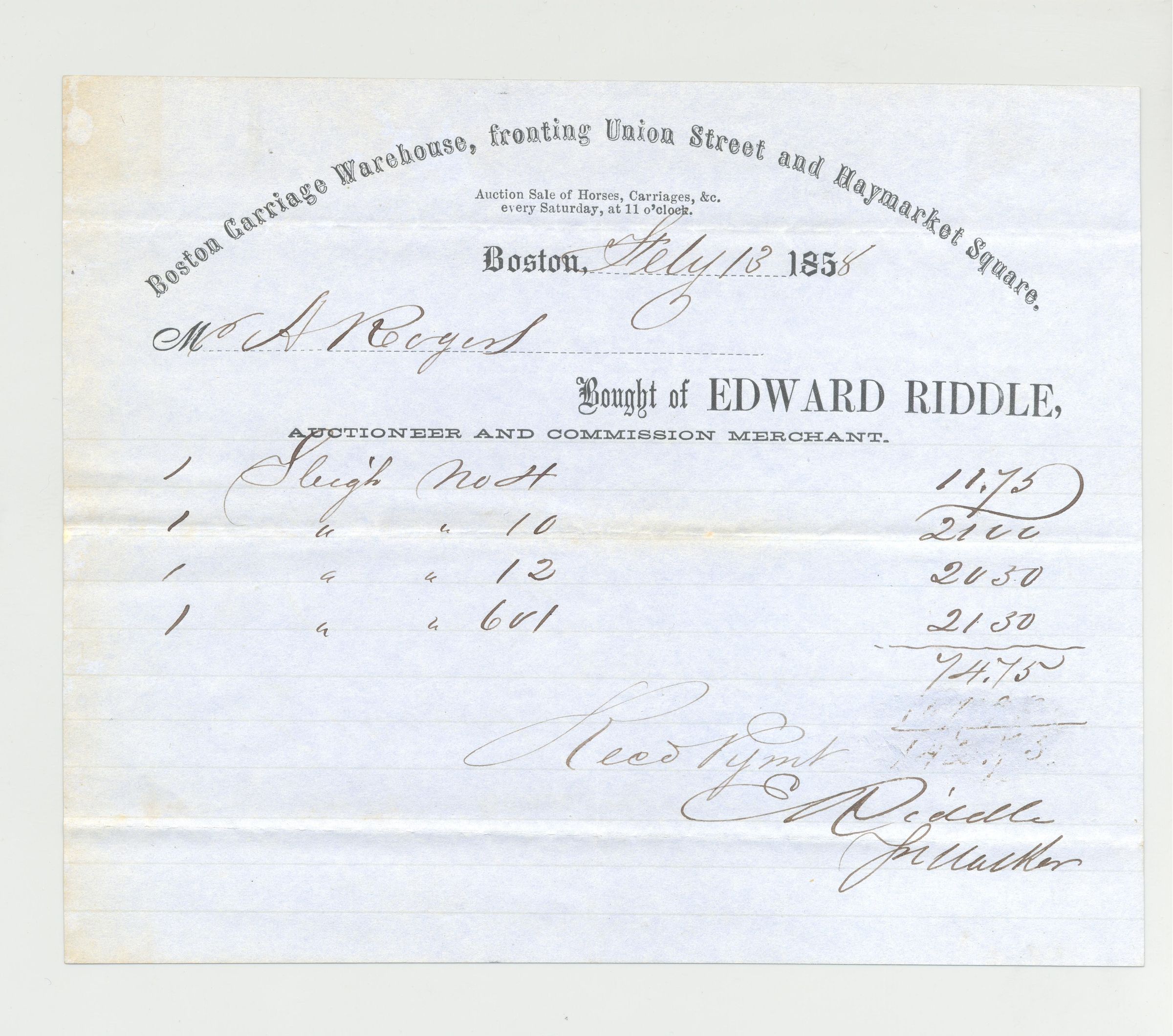 DOC, RECEIPT, 1858, MA. BOSTON CARRIAGE WAREHOUSE, FRONTING UNION ST AND HAYMARKET SQUARE. AUCTION SALE OF HORSES, CARRIAGES, ETC. EVERY SAT. EDWARD RIDDLE, AUCT.Created By