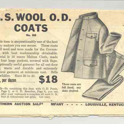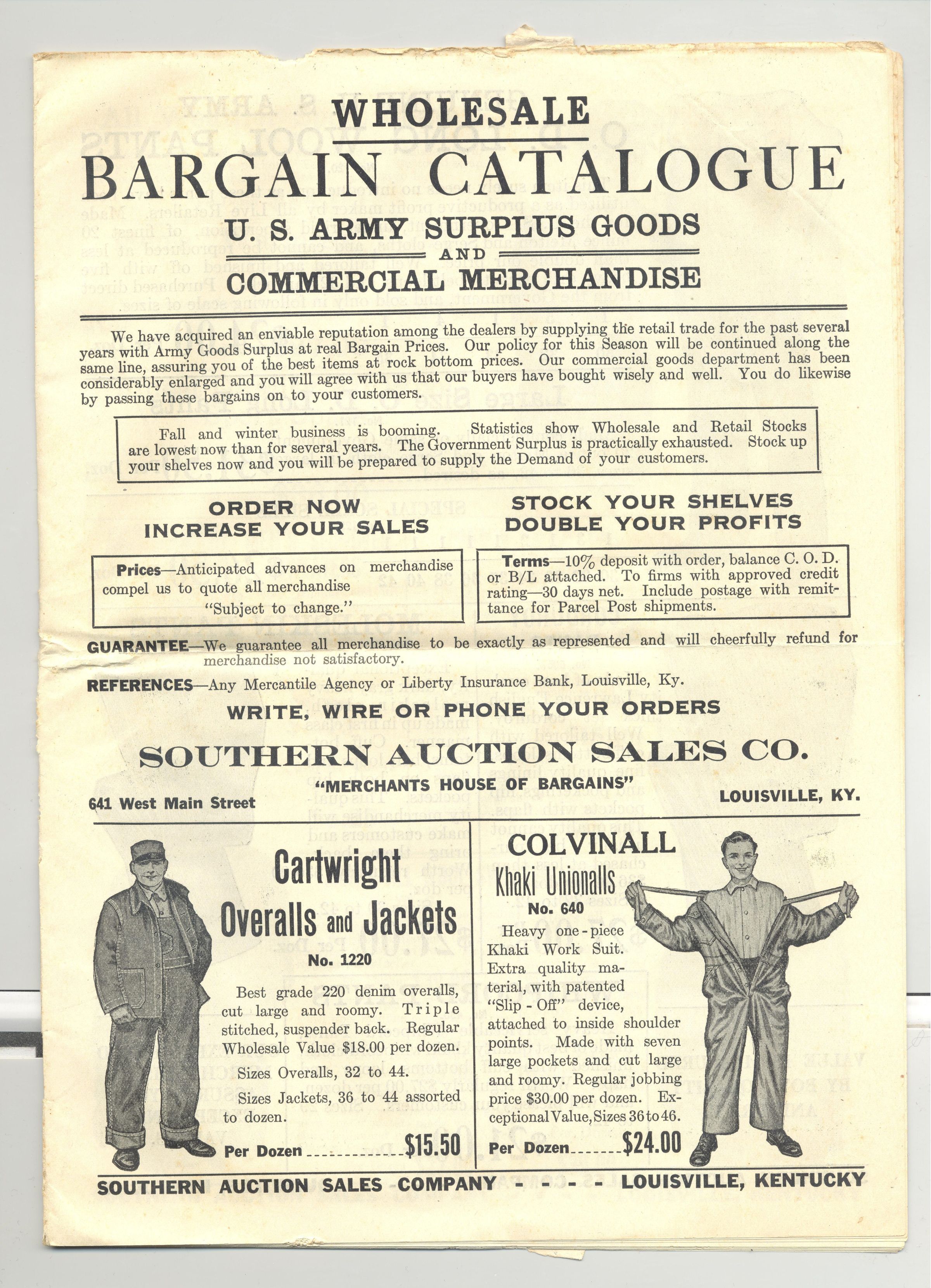 CAT, CLOTHING, 1924, KY. WHOLESALE BARGAIN, US ARMY SURPLUS GOODS. SOUTHERN AUCTION SALES CO. 8 " X 11"Created By