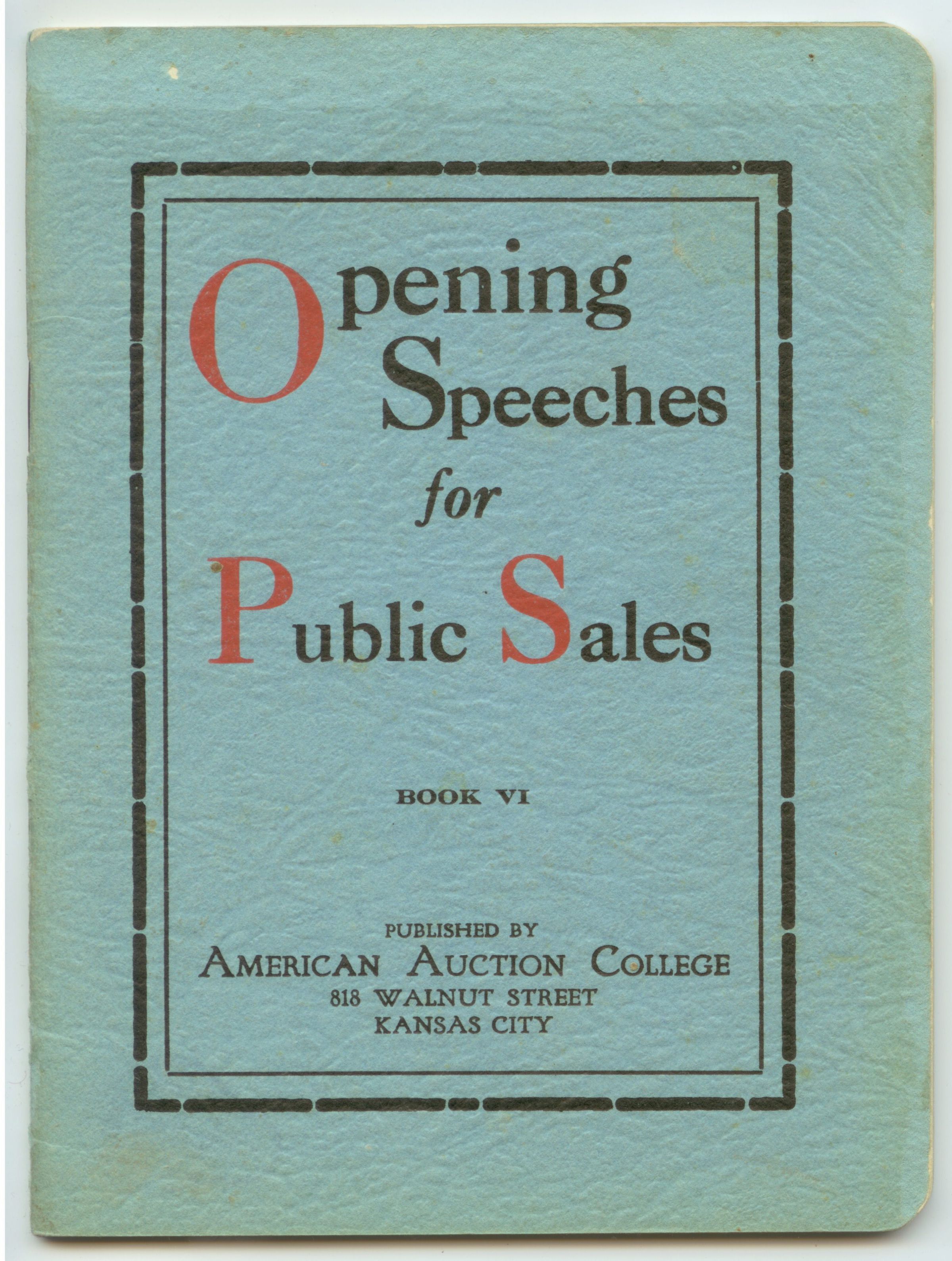 BKLT, AUCTION SCHOOL, MO. "OPENING SPEECHES FOR PUBLIC SALES" BK 6. PUBL BY AMERICAN AUCTION COLLEGE. 47 PP. 4 1/2" X 6"Created By