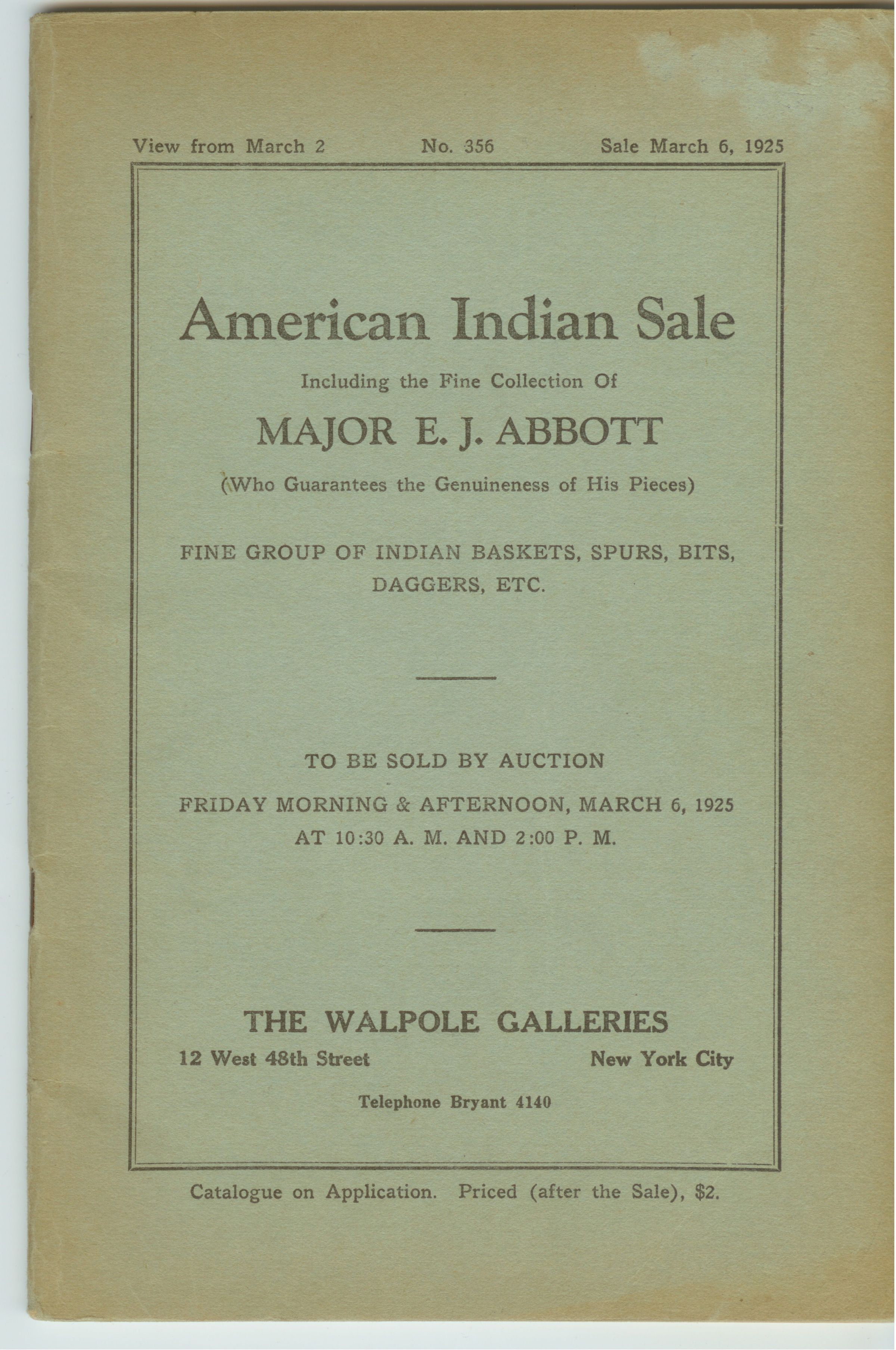 CAT, AMERICAN INDIAN, 1925, NY. INDIAN BASKETS, SPURS, BITS, DAGGERS, ETC. THE WALPOLE GALLERIES. 50 PP. 6" X 9"Created By