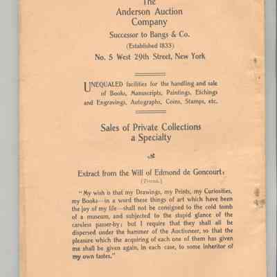 CAT, AMERICANA, BOOKS, 1907, NY. AUTOGRAPHS, BROADSIDES, BOOKPLATES. GEORGE MORSE, AUCT. THE ANDERSON AUCTION CO. 72 PP. 6 1/4" X 9"Created By