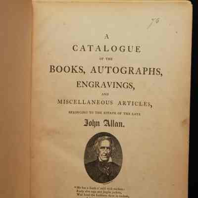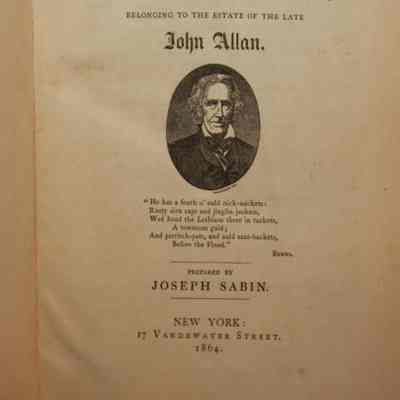 CAT, ESTATE, 1864, NY. BOOKS, AUTOGRAPH LETTERS, ENGRAVINGS, COINS, ETC. ESTATE OF JOHN ALLAN. JOSEPH SABIN, AUCT. BOUND HARDCOVER BOOK, SOME DAMAGE. INCL INDEX. PRICES AND BUYERS WRITTEN IN, 343 PP. 6" X 9" AND 1" THICKCreated By