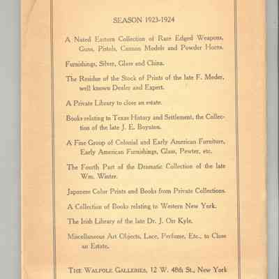 CAT, WEAPONS, 1924, NY. PISTOLS, ORIENTAL, EUROPEAN & AMERICAN. POWDERHORNS, EDGE WEAPONS, GUNS. THE WALPOLE GALLERIES. 45 PP. B/W PHOTOS, 6" X 9"Created By