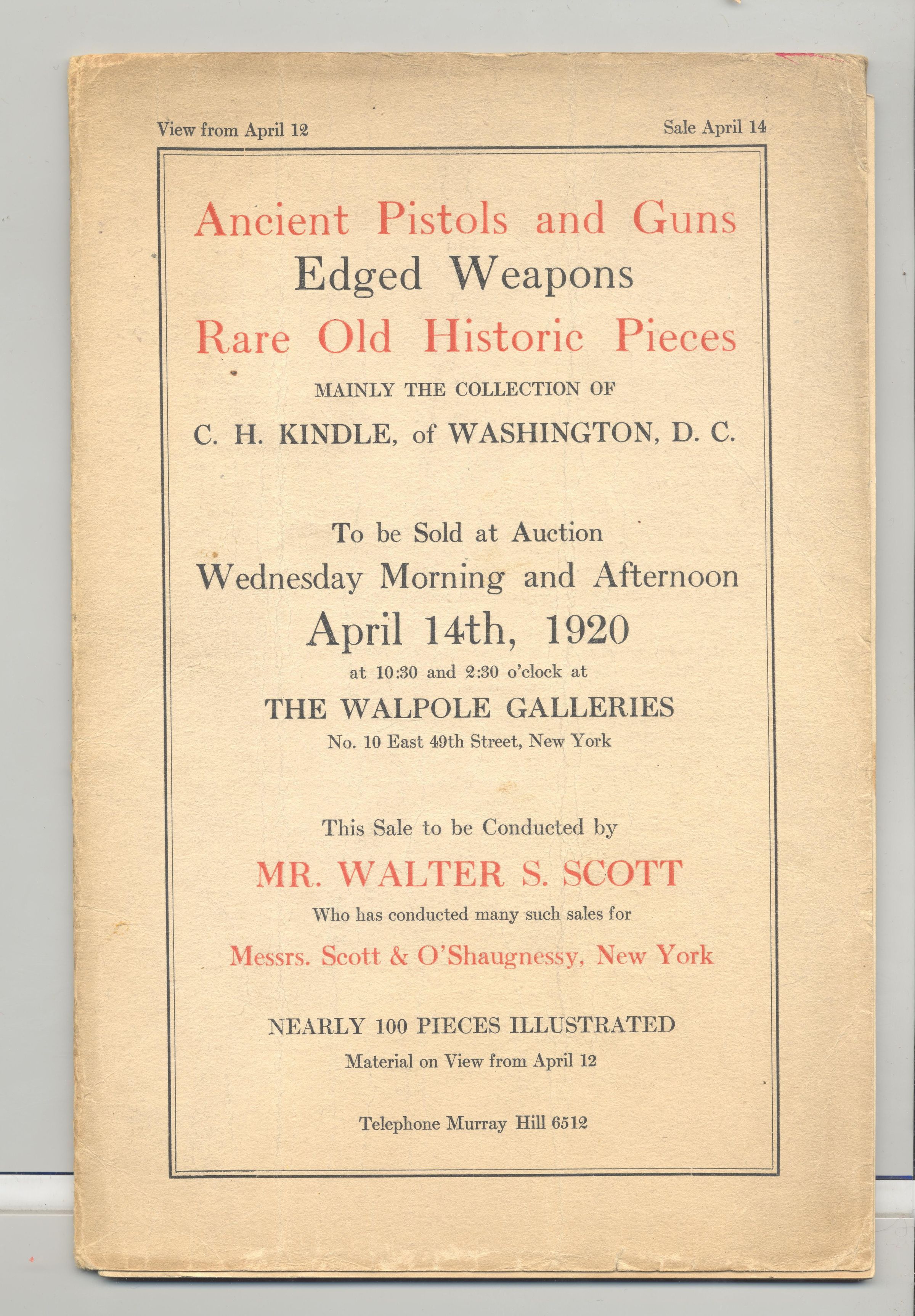 CAT, WEAPONS, 1920, NY. PISTOLS, EDGED WEAPONS, HISTORIC PCS. WALPOLE GALLERIES, WALTER SCOTT, AUCT. PRICES WRITTEN. B/W PHOTOS, 39 PP. 6" X 9"Created By