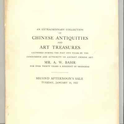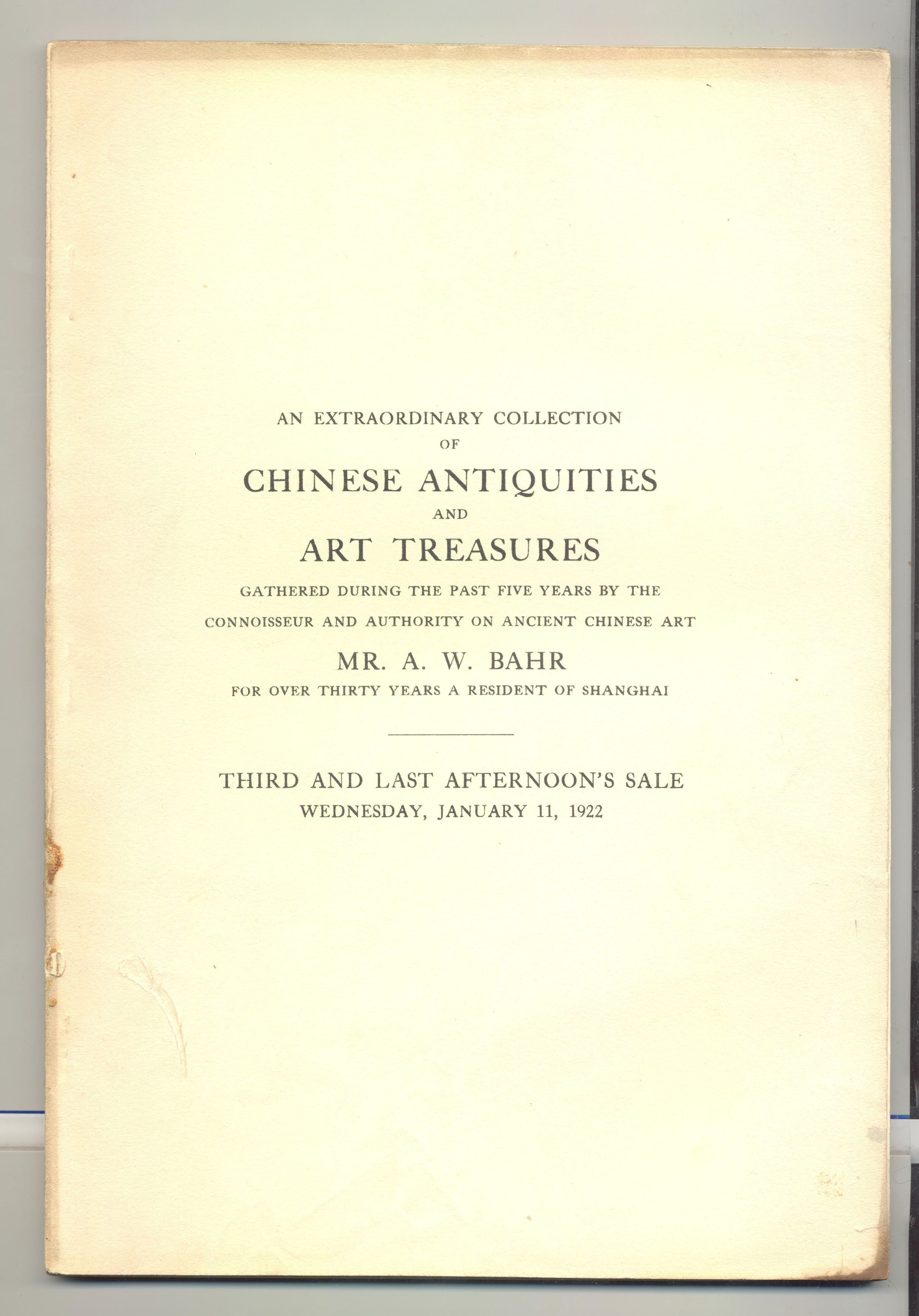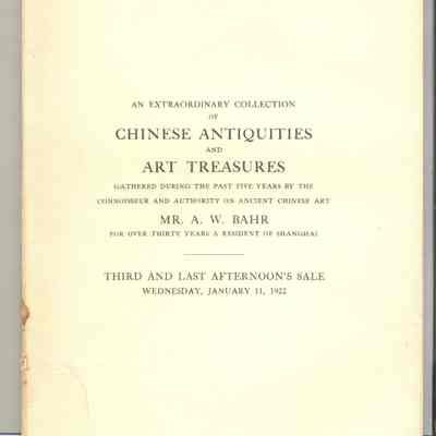 CAT, ART, 1922, NY. CHINESE ANTIQUITIES, ART TREASURES, COLLECTION OF A.W. BAHR. 3 VOL, 3 AFTERNOON SALES. AMERICAN ART ASSOC, AMERICAN ART GALLERY. PRICES WRITTEN, APPROX 100 PP ALTOGETHER, 6 3/4" X 9 3/4"Created By