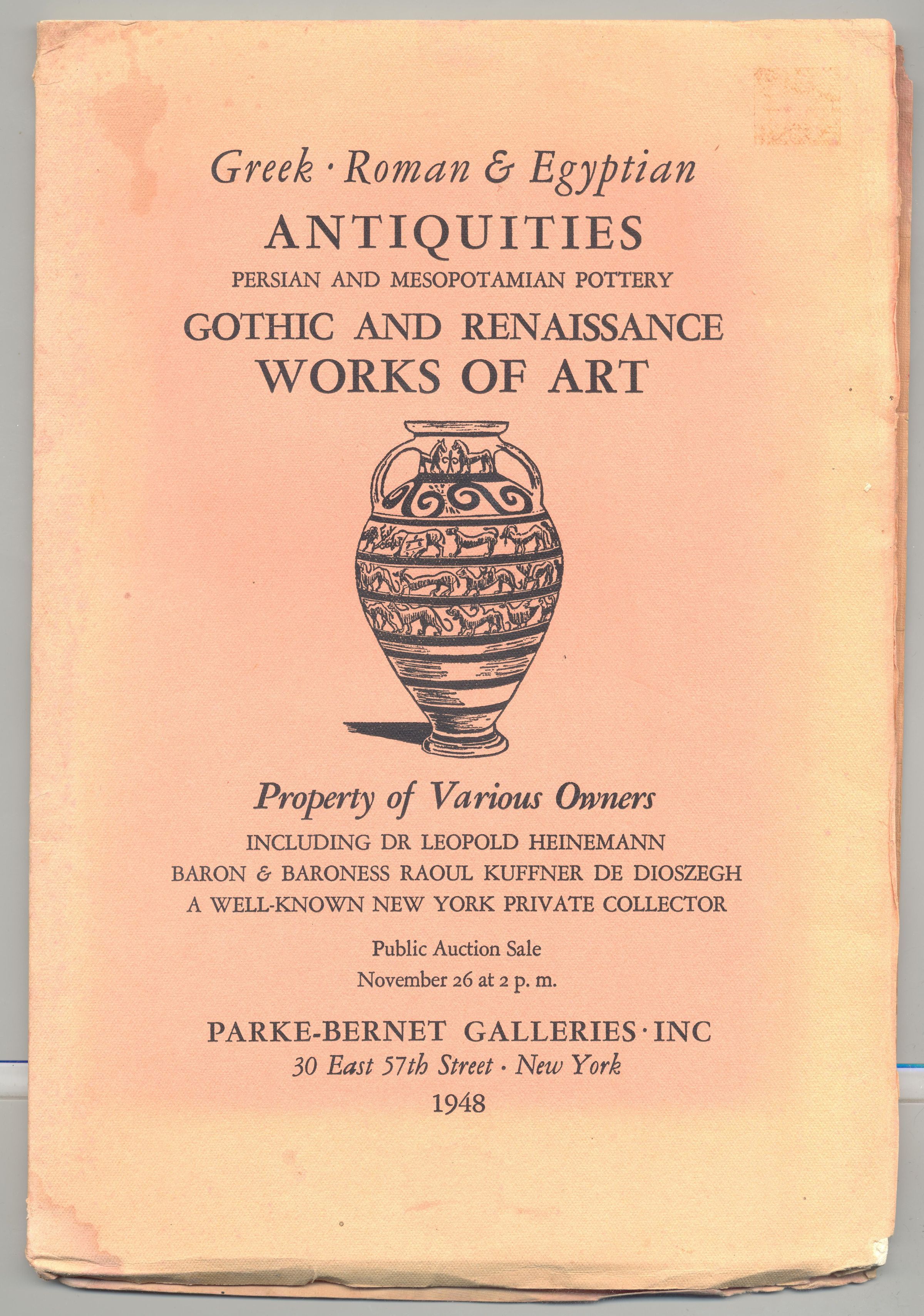 CAT, ART, 1948, NY. GREEK, ROMAN, EGYPTIAN ANTIQUITIES, GOTHIC AND RENAISSANCE WORKS. PARKE-BERNET GALLERIES, INC. 66 PP, 7" x 10" B/W PHOTOSCreated By
