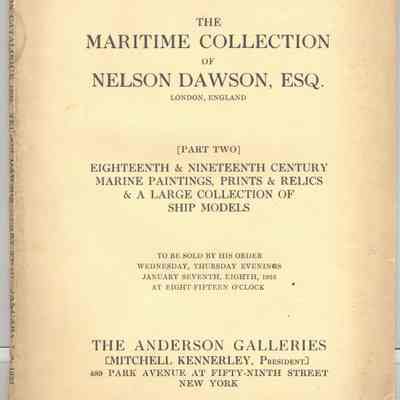 CAT, ART, 1925, NY. THE MARITIME COLLECTION OF NELSON DAWSON, ESQ, LONDON. 18TH & 19TH C MARINE PAINTINGS, PRINTS, RELICS, SHIP MODELS. THE ANDERSON GALLERIES, PRICES WRITTEN, 48 PP. 7 1/4" X 10"Created By