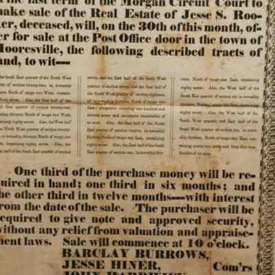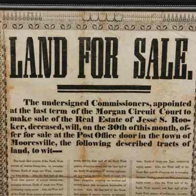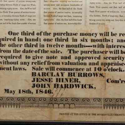 FR, AD, 1846, REAL ESTATE, MOORESVILLE. (NO STATE), BURROWS, HINER, HARDWICK, COMMISSIONERS. PRINTED AT THE OFFICE OF THE MOORESVILLE CHRONICLE. 12 1/2" X 15 1/2"Created By