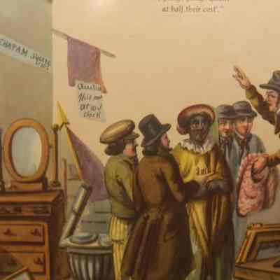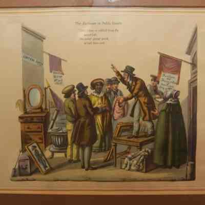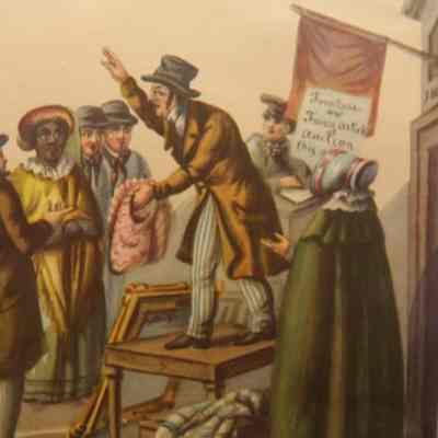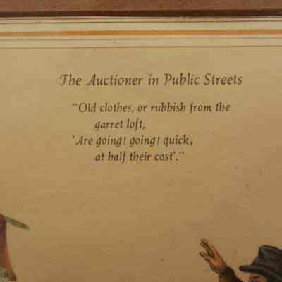 FR, STREET AUCTION PRINT. CHATAM SQUARE, "THE AUCTIONEER IN PUBLIC STREETS, OLD CLOTHES OR RUBBISH FROM THE GARRET LOFT, ARE GOING! GOING! QUICK, AT HALF THEIR COST!" 12 3/4" X 9 3/4"Created By