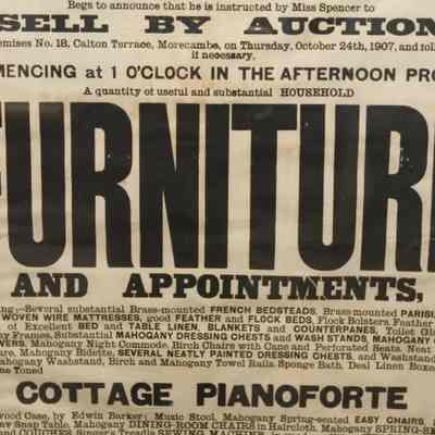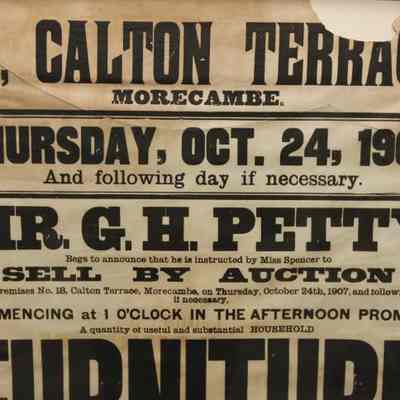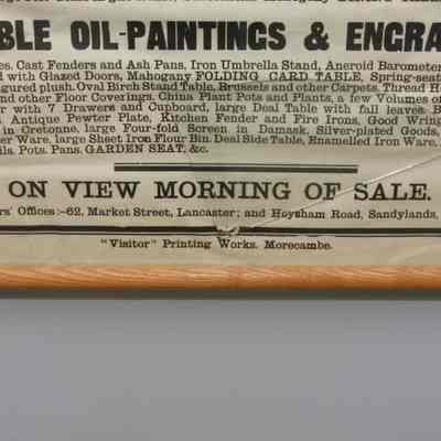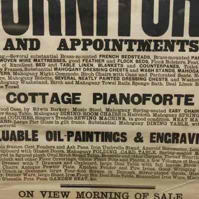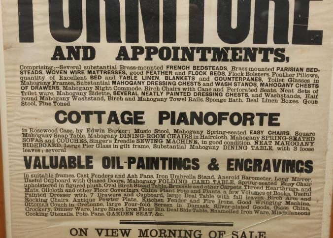 FR BROADSIDE, ESTATE SALE, 1907, MORECAMBE, ENGLAND. G.H. PETTY, AUCTIONEER. PARTIAL LISTING OF ITEMS. VERY LARGE SIZE BROADSIDE. 27 1/2" X 41"Created By
