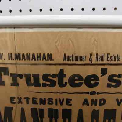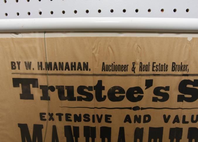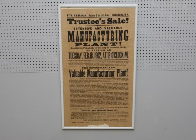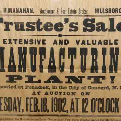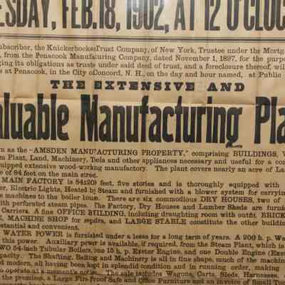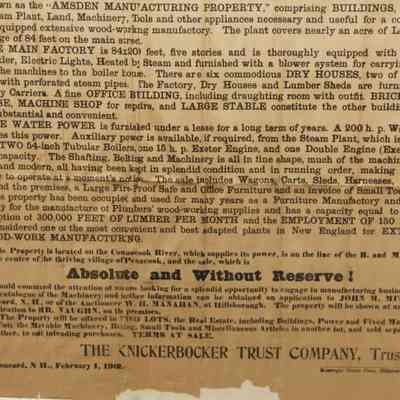FR BROADSIDE, COMMERCIAL LIQUIDATION, 1902, NH. TRUSTEE'S SALE - EXTENSIVE AND VALUABLE MANUFACTURING PLANT KNOWN AS "AMSDEN MANUF. PROPERTY" LISTING OF BLDGS AND ITEMS TO BE SOLD. NO RESERVE. W. H. MANAHAN, AUCTIONEER. 25 1/2" X 40"Created By
