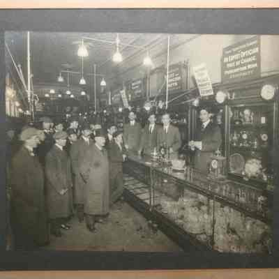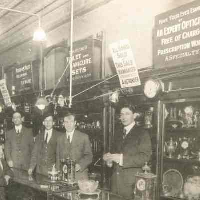 FR PHOTOGRAPH, COMMERCIAL LIQ, MEN IN STORE, GLASSWARE, HOUSEWARES. SIGN IN BACKGROUND SAYS "HAVE YOUR EYES EXAMINED BY AN EXPERT OPTICIAN FREE OF CHARGE" 14" X 13"Created By